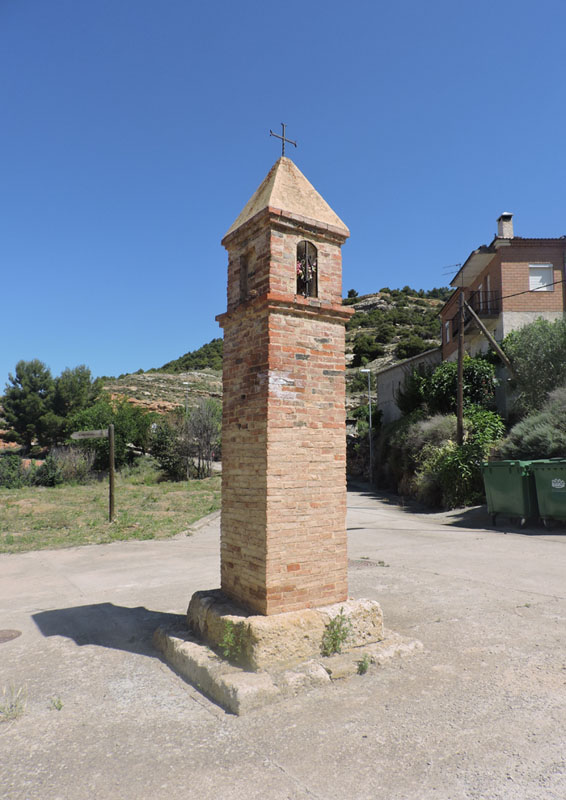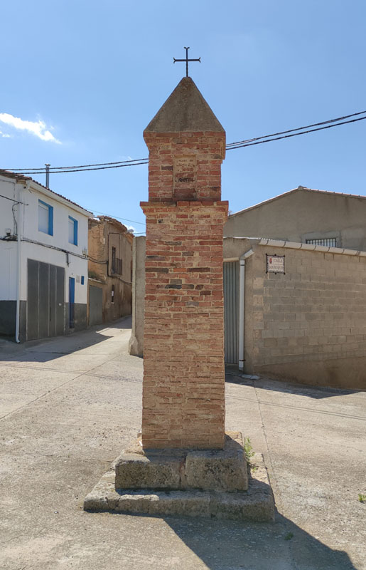 Tiene una grada cuadrada en piedra que está medio oculta por el suelo. La  basa también es de piedra. Sobre la basa se levanta el fuste prismático cuadrado de ladrillo. Entre el fuste y el edículo hay una cornisa doble de ladrillo. En el edículo se abre con una capilla de arco apuntado con la imagen de San Roque, en los otros tres lados se abren otras tres hornacinas pero están vacías. El cimacio es piramidal y se culmina con una pequeña cruz de hierro.