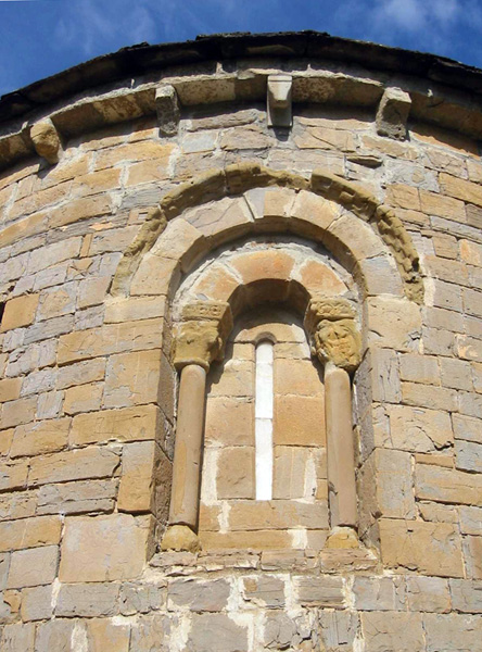 En el centro del ábside abre una ventana en arco de medio punto doblado protegida por un trasdós con ajedrezado. El arco interior apea sobre columnas de fuste cilíndrico con capiteles, cuya decoración figurada se encuentra muy erosionada. Canetes de piedra, algunos labrados con rostros, sostienen un alero voladizo que recorre ábside y presbiterio.